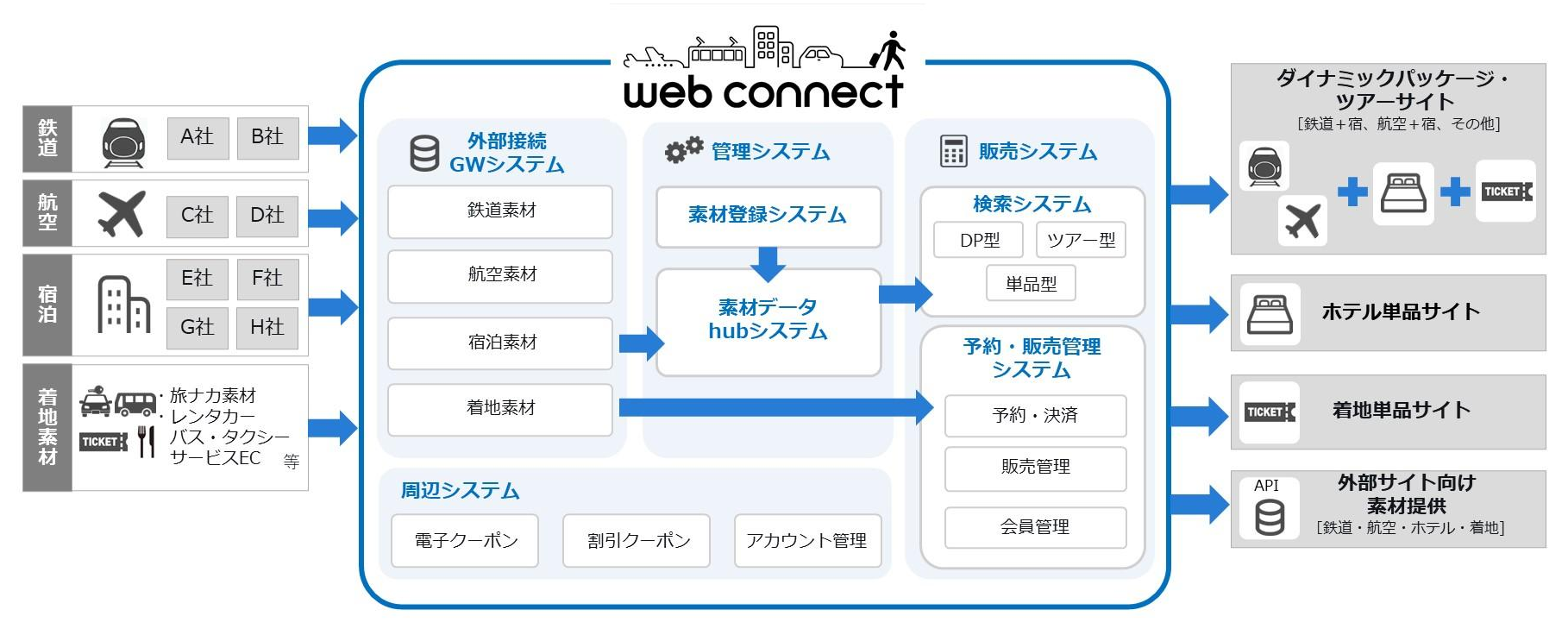 webコネクトは、必要な機能を必要な範囲で利用可能なSaaS型プロダクトです。商品のオンライン販売に求められる素材登録(造成)、検索、予約、電子クーポン、外部接続ゲートウェイといった機能群をモジュール化しており、商品登録(造成)・商品検索・商品流通・販売を、柔軟かつスピーディに実現します。