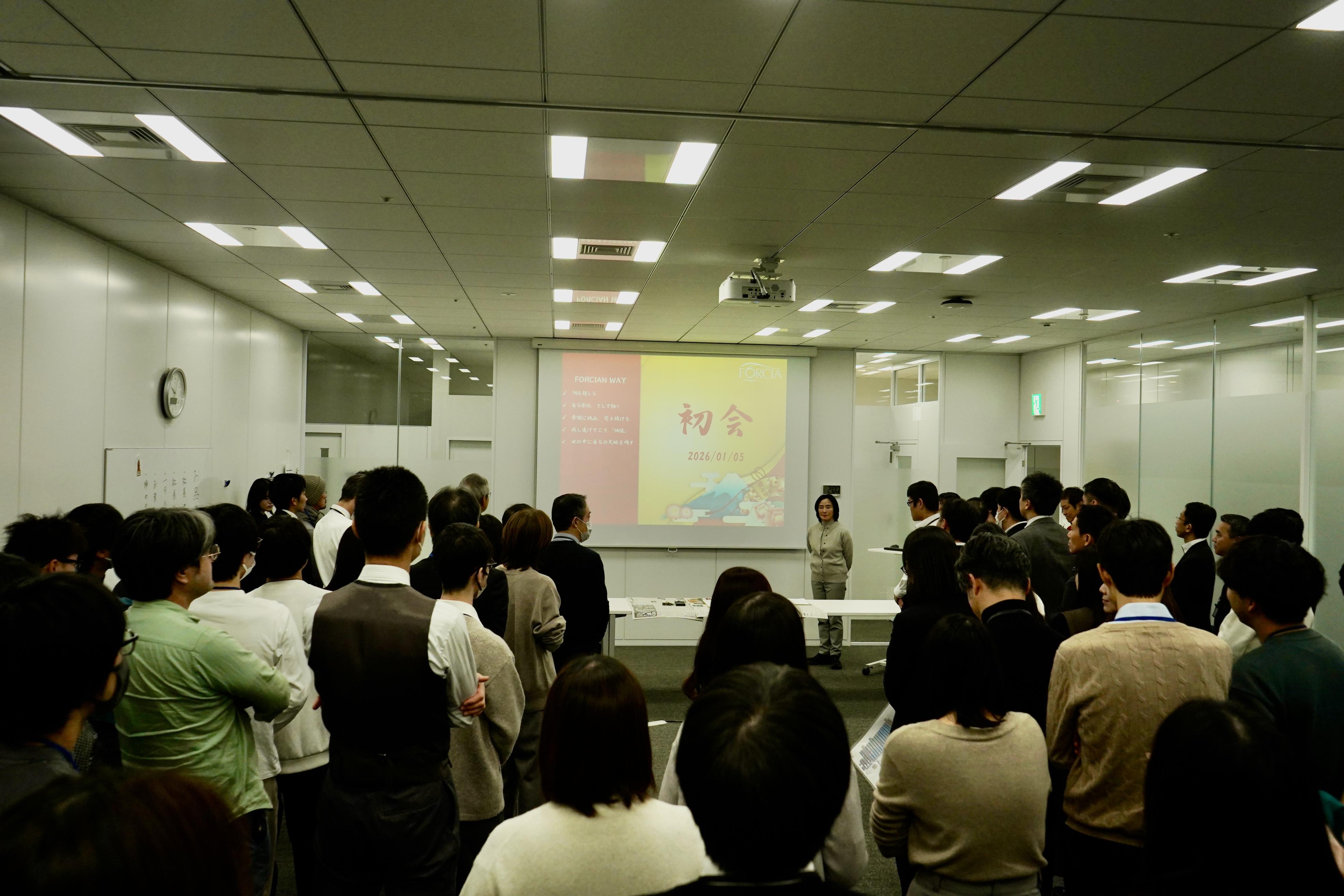 フォルシアでは毎年、仕事始めの日に「初会」を行います。 社長の年始の挨拶だけでなく、その年の指針となる「今年の漢字」の発表や、新入社員が企画・運営するレクリエーションなど、社員の士気を高め、結束を深める大切なイベントです。